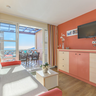 Un séjour spacieux prolongé d’une ravissante terrasse vue mer, exposée EST/Sud et protégée par un store électrique.